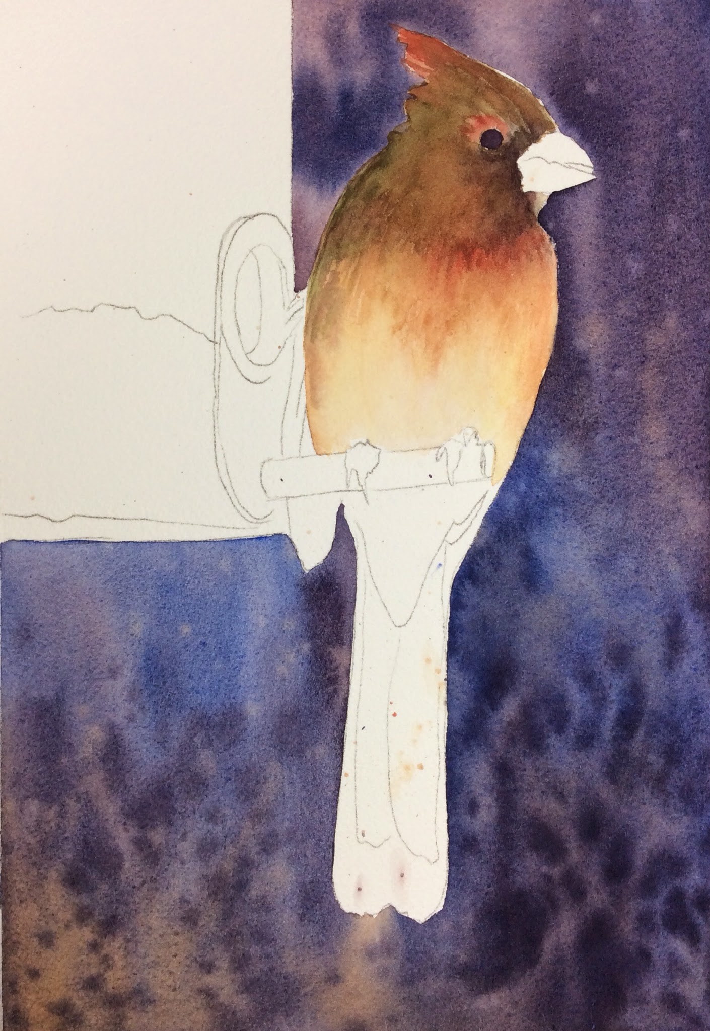 cobalt teal to it. It is VERY light.....don't be heavy handed with it.....remember we are downplaying this area. After this dries, I made a little heavy mix of the initial violet I used to paint the basket and put in some minute details.....adding a little more cobalt to darken towards the bottom. You might have to add a little yellow to tone down that violet shadow if you don't already have it in your mix.....don't make that shadowed violet too violety....(my word).