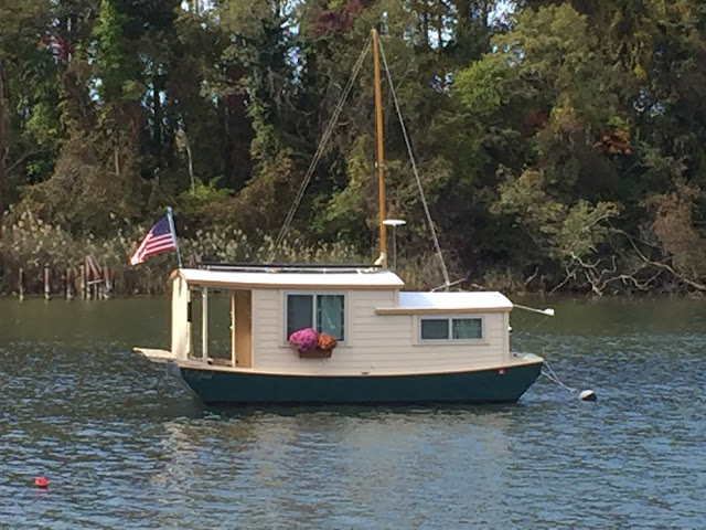 I took this photo near Greenbury Point in one of the coves down there and found this adorable house boat which was hand built.  The colors of the boat, the flowers, the water and the flag all attracted me to want to paint this.