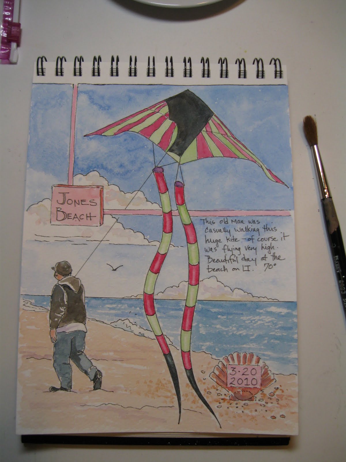 Went to Long Island last weekend and went to Jones Beach. Gorgeous weekend. This kite caught my eye and wanted to make some kind of designy looking entry into my journal. Don't know if I accomplished that but it was fun to do. I'm so hooked on this journal thing that I don't want to cook dinner at night.....uh oh sorry Paul! I let him paint a little part on the left of the kite....(had to rework it....sorry again Paul). Finally got dinner cooking at 7.......this daylight saving time has really got my timing messed up!