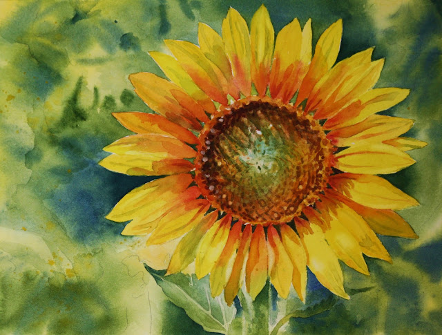 This is the first step, or maybe I should say many steps later than the first step. I forgot to take photos of the progress.....guess I got into to it too much. I have to say I almost like this painting better than the finished one. It's more simplified and fresh looking......guess I need to know when to stop! I started by masking out the petals with masking fluid just halfway. Then I could put the background in easily. I painted wet on wet with new gamboge sporadically. Then I used sap green sporadically making sure that the yellow I just put down shows through in places. I used ultramarine blue in places also where I wanted dark areas. After that dried, I took off the masking. Then proceeded to paint the petals.....some with new gamboge, others with winsor yellow. I used permanent rose on petal bases while still wet to have a blended effect. I then worked on the center. I wet it first then dropped in new gamboge then sap green around the center, being carefl to leave some white in the center. You can always blot it you cover it up. Then while wet I added burnt sienna around the edges. When that dries I painted the area around the edge of the center with new gamboge and burnt sienna in places. The petal shadows I put sap green on and just intensified the areas of permanent rose with some burnt sienna and perm. rose mixed together. Those are all the colors I used throughout the painting......by looking at the finished painting you can see how to do the remainder. |
