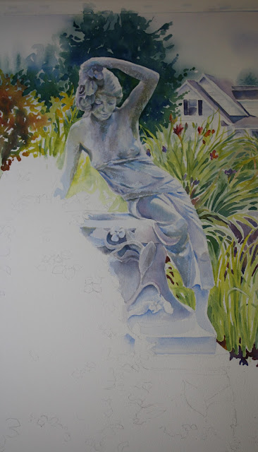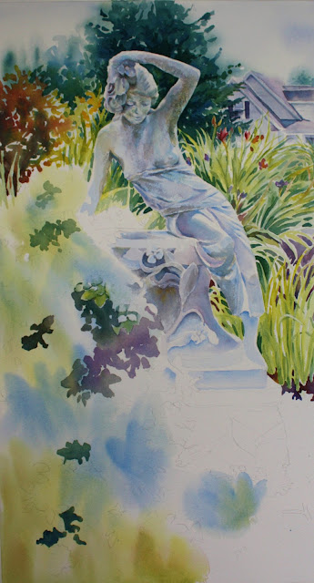There is a house in the background that I added for depth and to make it look like a home garden. I tried to not put a lot of emphasis on it so I painted it with cobalt blue but later could see it still stood out too much. That's later. The roof of the house was painted with watered down cobalt blue and a little permanent rose in the mix. Those colors are used throughout the house. The shadows on the roof have much more cobalt in them and I don't think I used any perm. rose at all actually. The shutters are cobalt and burnt sienna with a little perm. rose. I then began to work the evergreen in the back of the statue. Using the same colors of ultramarine and winsor yellow but in a darker mix (less water). I try not to mix the paint too much on my palette. I like to see the individual colors that I use so you will see more blue in areas and more yellows in others. It's my style, so if you don't choose to do that, it's up to you .....but that's what I enjoy about watercolor.....it allows you to do that and it adds beautiful variation within your work. I decided later that I needed to move the tree a little further out to the right of her extended arm covering more of the house. The outline of the tree was following too close to the figure's form. So if you want to do that now you can instead of doing it later like I did. You can see from the first picture I posted where I went with that. I didn't totally darken the tree.....I will go back later for that. I don't want to darken areas too much too early....easier to darken than to lighten! Just want to take note of the negative painting done where the lilies come up into the evergreen. You can draw them in to make it easier for you to see. I just eyeballed it....sometimes it's a little more spontaneous for me. Next I moved over to the left to do the red bush. I used perm. alizarin crimson and raw sienna (you can you yellow ochre). First I made a mix of the two (more alizarin) and I also used the raw sienna separately. I started with the raw sienna toward the top of the bush and then added my mix into it. I wanted the top of the bush to appear a little lighter. I also added green into it towards the bottom of the bush with the same mix as the evergreen. It created a shadowed effect. Also being careful to do negative painting of the lilies in front of the bush. As you move over towards the figure, there are some yellow lilies there. I used winsor yellow for the flower tips and used a cobalt and winsor yellow (more yellow) mix to do the leaves. I added more cobalt to create a darker value (not too dark) within the leaves. Basically the lily leaves all over the painting to the right have 3 values. The light green (cobalt and winsor yellow), medium green...(more cobalt) and a darker value green (ultramarine and winsor).