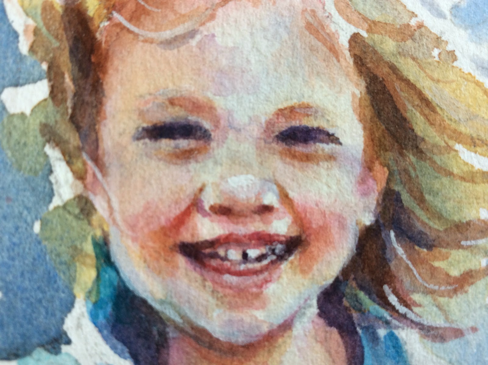 Here's a closer view of her features. I darkened the upper eyelids with more of the skin tone. Put a few more blue in places. Glazed the skin with raw sienna in areas on the left side of her face, sides of her mouth, cheeks. Also glazed areas with perm. rose after that dried. The bridge of the nose has a shadow on it. I used raw sienna, let that dry and used cobalt. Some of these glazes have to dry in between. You can't add wet on wet sometimes because the colors will just get lost. This is not a very large picture so that makes it more difficult.