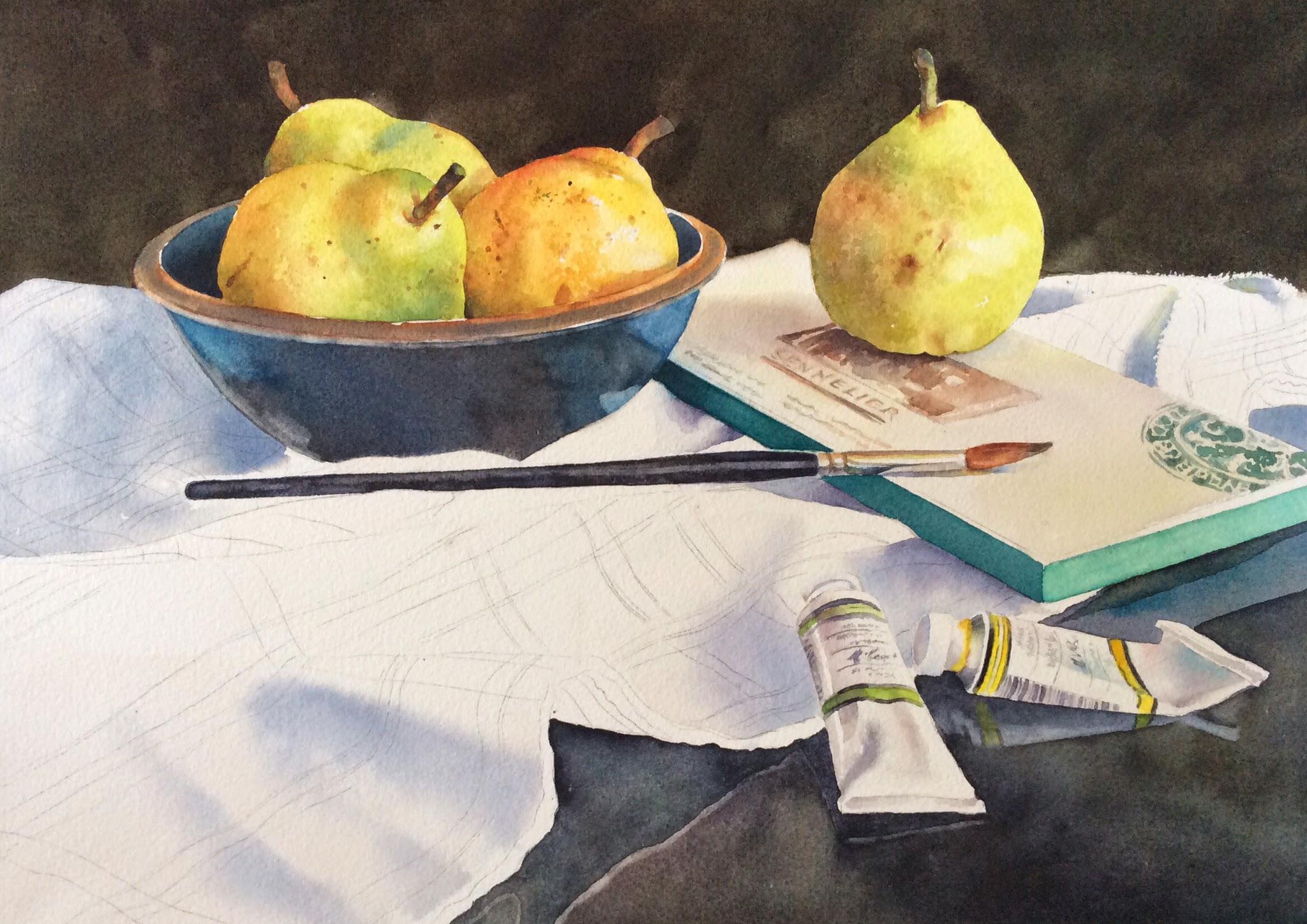winsor yellow. Some areas of the skirt I added more yellow, some I added more teal......all watered down a good amount. The darker folds of the skirt I added some ultramarine to that mix and I made it slightly stronger (used less water). There is a little scalloped edge separating the top and bottom of the skirt. I darkened under that scalloped edge.