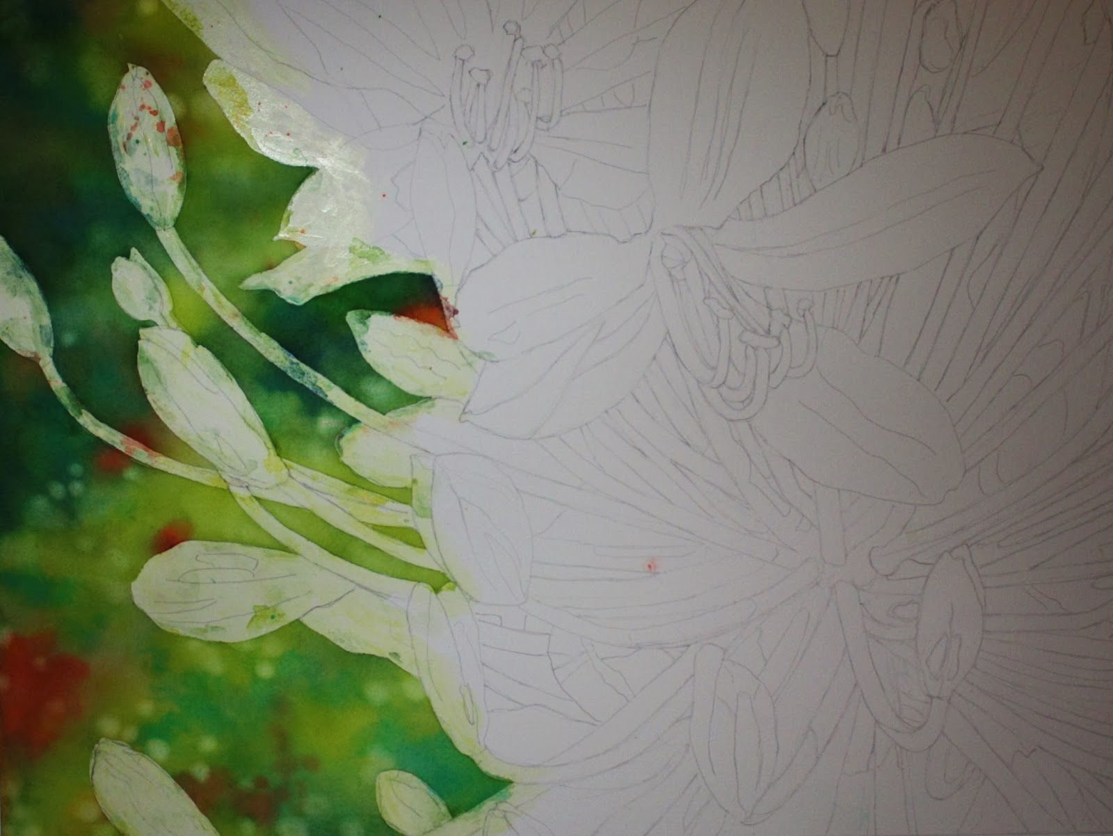 I began by masking out the stems and buds on the left side....anywhere that the background touches the flowers on the left. Then wet on wet I painted the background. Using sap green, ultramarine blue, winsor yellow for the main parts of the background. I added orange sections with cadmium red and winsor yellow. Most of these colors I dropped in on top of each other....not mixing on my palette. I did mix sap green and ultramarine in places to get a dark, but also put in some of those color separately. I also added an M. Graham color of cobalt teal in places. After that was dry, I went over it in certain places again just to darken. You don't have to re-wet the whole area....just parts you want to change. After that was dry again, I actually removed some paint with a wet brush, scrubbing and blotting out those areas I wanted lighter and also with a rounder scrub brush, made little circle halos around.