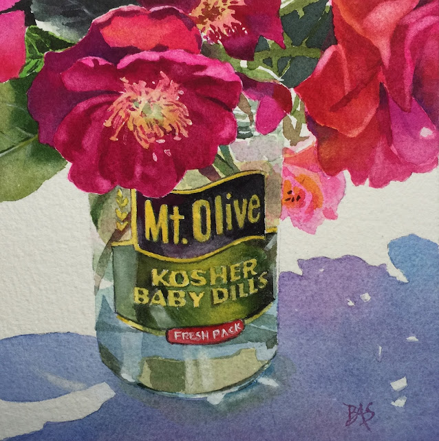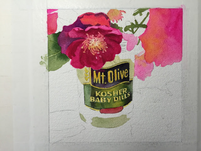 Some of the rose petals are warmer and some cooler. The warmer ones I mixed the quin rose with winsor yellow. The other cooler areas I used just quin. rose and/or opera rose.